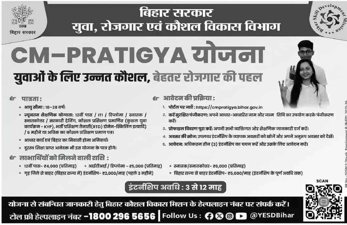 Bihar CM Pratigya Internship Yojana बिहार सरकार की एक रोजगार उन्मुख योजना है। इस योजना का उद्देश्य युवाओं को कंपनियों में इंटर्नशिप के माध्यम से प्रैक्टिकल ट्रेनिंग और स्किल डेवलपमेंट प्रदान करना है।