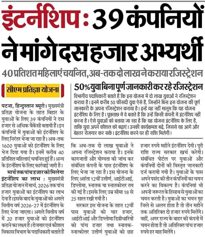 ताजा जानकारी के अनुसार Bihar CM Pratigya Internship Yojana 2026 योजना के अंतर्गत 39 कंपनियां जुड़ चुकी हैं, जो मिलकर 10,000 से अधिक इंटर्नशिप अवसर उपलब्ध करा रही हैं। अब तक 2 लाख से अधिक युवाओं ने रजिस्ट्रेशन किया है और लगभग 1600 युवा इंटर्नशिप शुरू कर चुके हैं, जिनमें करीब 40% महिलाएं शामिल हैं।