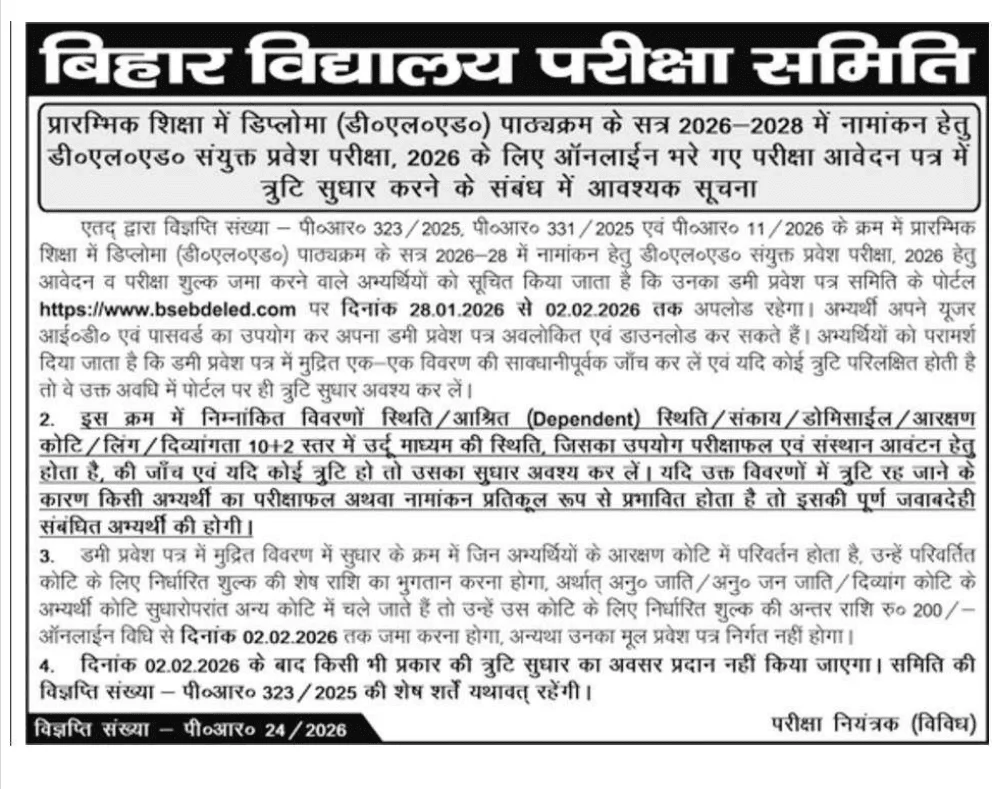 यदि आपके नाम, जन्मतिथि, फोटो, सिग्नेचर, कैटेगरी या किसी भी अन्य जानकारी में गलती है तो उसे अभी सुधारने का मौका दिया गया है। बाद में सुधार का अवसर नहीं मिलेगा। इसलिए सभी अभ्यर्थियों को सलाह दी जाती है कि वे तुरंत अपना Bihar DELED Dummy Admit Card 2026 Download करके जांच अवश्य करें।