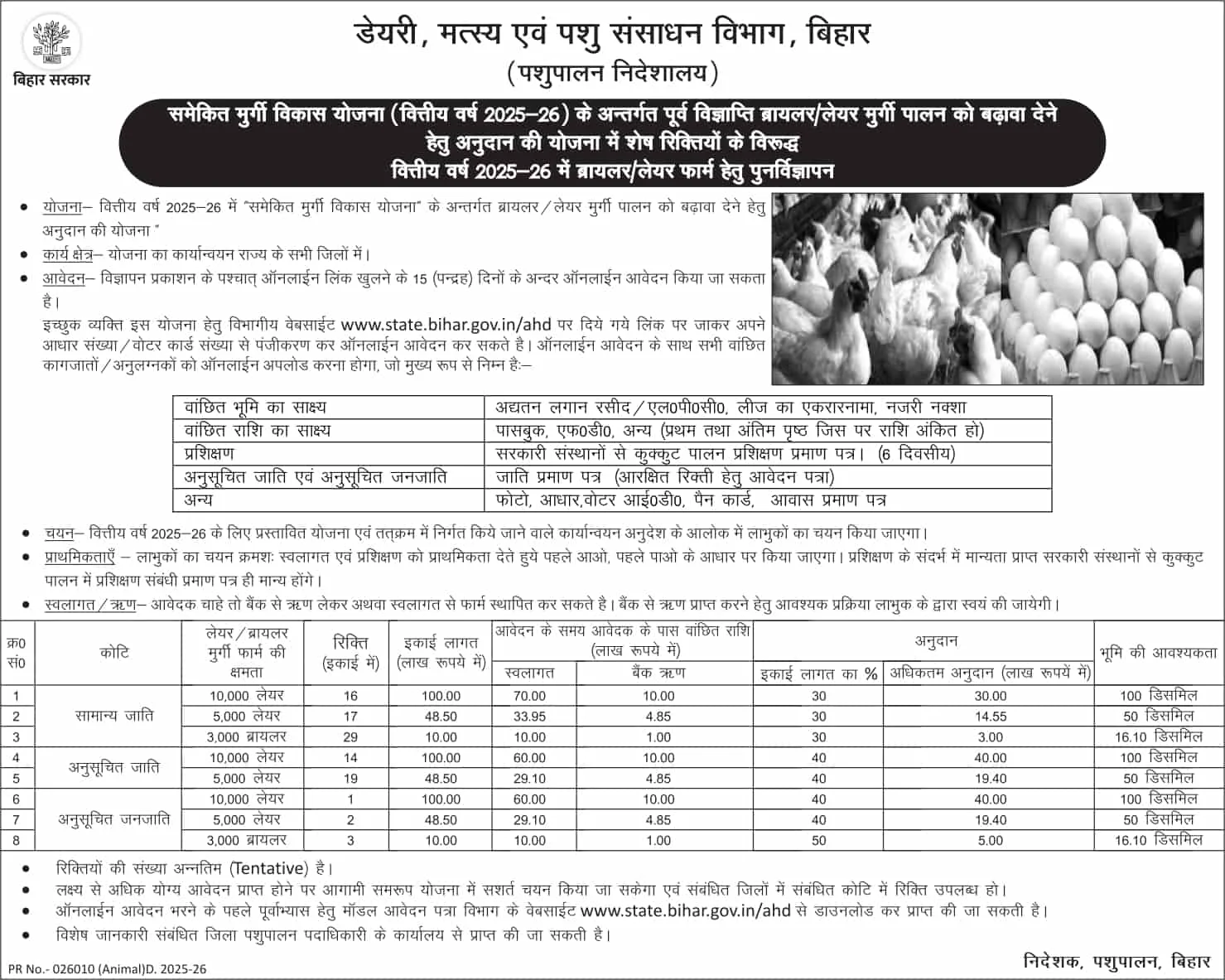 यह योजना बिहार सरकार द्वारा चलाई जा रही है जिसका उद्देश्य राज्य में ब्रायलर और लेयर मुर्गी पालन को बढ़ावा देना है।