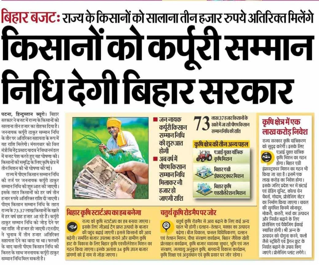 बिहार सरकार किसानों को अतिरिक्त आर्थिक सहायता देने के लिए जननायक कर्पूरी ठाकुर सम्मान निधि योजना शुरू करने की घोषणा कर चुकी है।