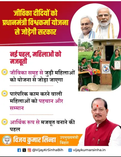 PM Vishwakarma Yojana For Jeevika Didi 2026 के तहत जीविका दीदियों को जोड़ना एक बड़ा कदम है। इससे न सिर्फ महिलाओं को रोजगार मिलेगा, बल्कि वे आत्मनिर्भर बनेंगी और अपने परिवार की आर्थिक स्थिति मजबूत करेंगी।